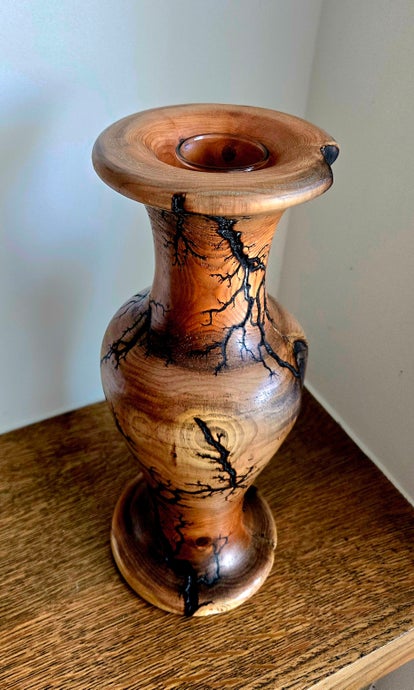 Turned from a single piece of yew, this vase showcases the natural warmth and depth of the wood, accentuated by intricate Lichtenberg burns that trace across its surface like veins of captured lightning. Each branching pattern is unique—etched by electricity, guided by nature, and sealed beneath a soft, polished finish.