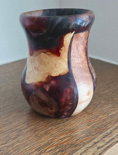 Formed from reclaimed wood offcuts and deep resin hues of red and brown, this bud vase embodies the meeting of movement and stillness. The resin flows like molten earth around each grain of wood, creating a surface that feels alive with warmth and depth.